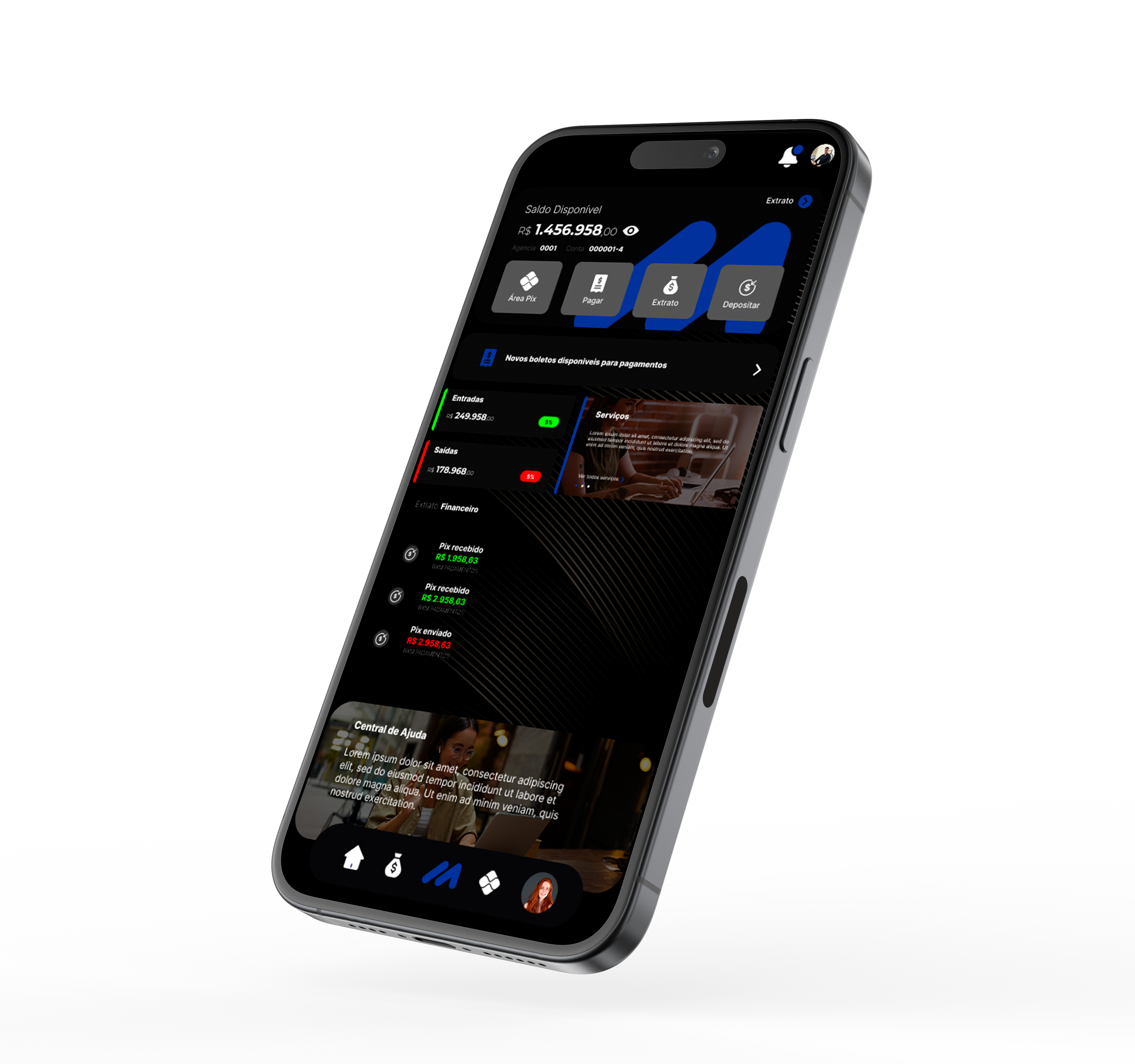 Saldos, transações e KPIs financeiros em tempo real.