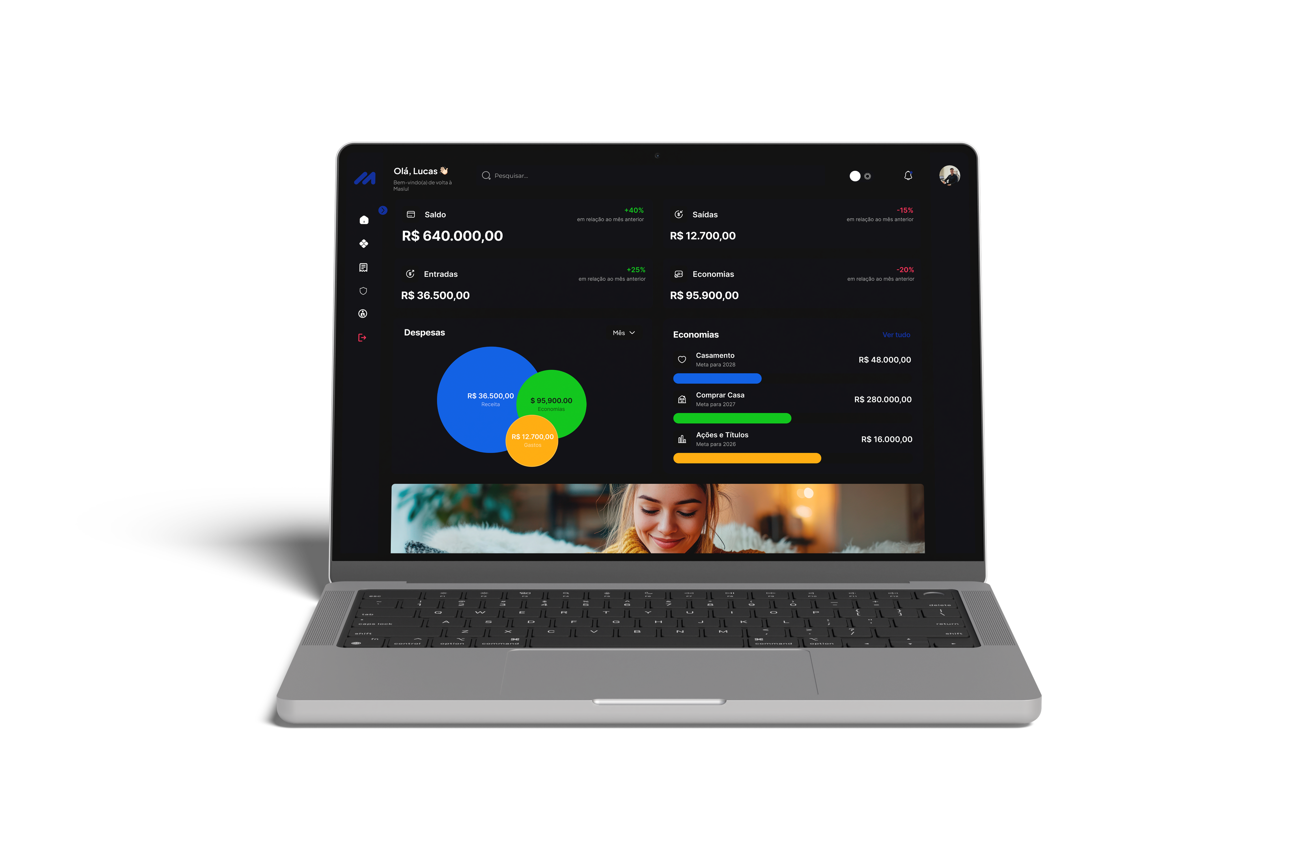 Conta, Pix, boleto e transferência em uma única interface. A Maslul elimina as camadas desnecessárias para que sua equipe opere com velocidade real.